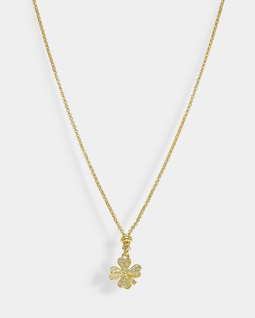 Ένα διακριτικό και κομψό χρυσό κολιέ, ιδανικό για να προσθέσει μια πινελιά καλής τύχης στην καθημερινότητά σας. Η λεπτή χρυσή αλυσίδα συγκρατεί ένα πανέμορφο μενταγιόν σε σχήμα τετράφυλλου τριφυλλιού, το οποίο διακρίνεται για την ιδιαίτερη ανάγλυφη υφή του που αντανακλά το φως. Ο μινιμαλιστικός σχεδιασμός του το καθιστά ένα ευέλικτο κόσμημα που μπορεί να φορεθεί μόνο του ή σε συνδυασμό με άλλα κολιέ.