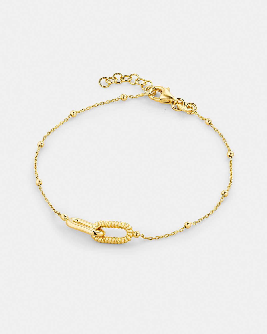 Αυτό το κομψό χρυσό βραχιόλι αποτελεί μια εκλεπτυσμένη επιλογή για κάθε γυναίκα που αναζητά τη λεπτομέρεια στο στυλ της. Η αλυσίδα του, διακοσμημένη με μικρές χρυσές σφαίρες, προσδίδει μια κλασική γοητεία, ενώ οι δύο κεντρικοί αλληλένδετοι κρίκοι, ένας λείος και ένας με ανάγλυφη, στριφτή υφή, δίνουν μια μοντέρνα διάσταση στο κόσμημα. Διαθέτει κούμπωμα ασφαλείας και προέκταση με κρίκους για να προσαρμόζεται ιδανικά στον καρπό σας, προσφέροντας λάμψη και άνεση καθ’ όλη τη διάρκεια της ημέρας.