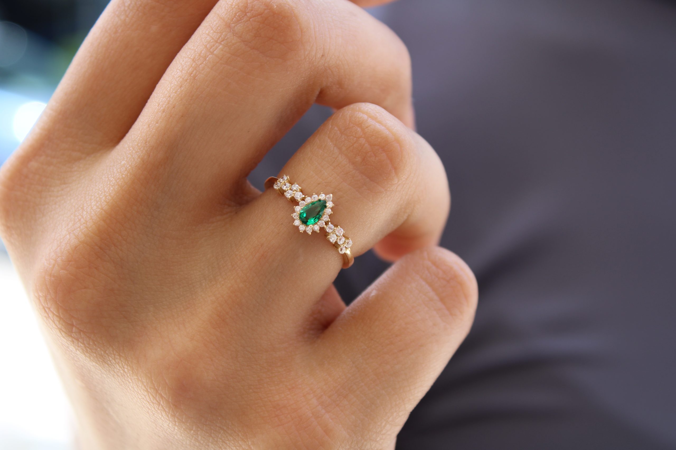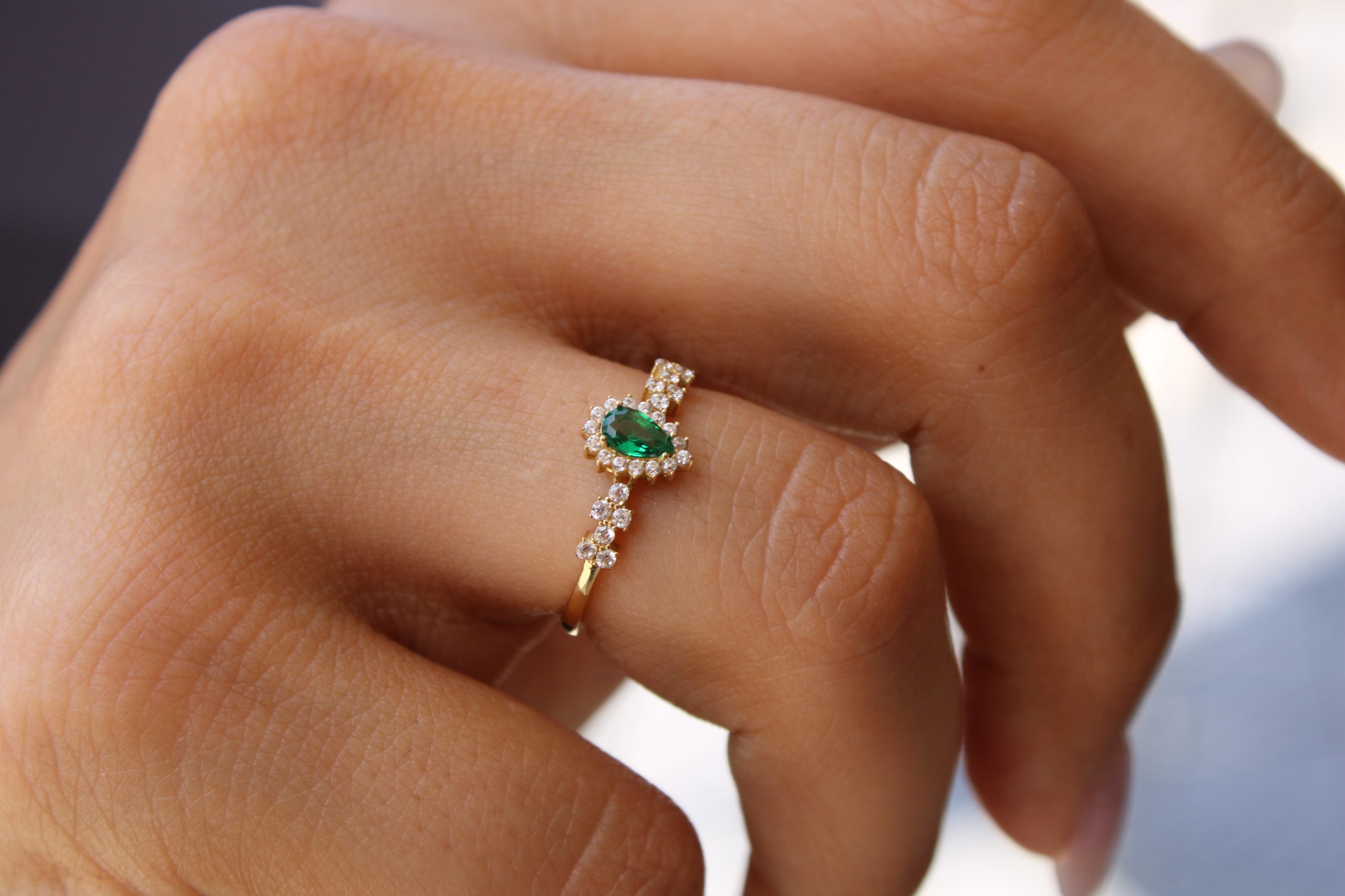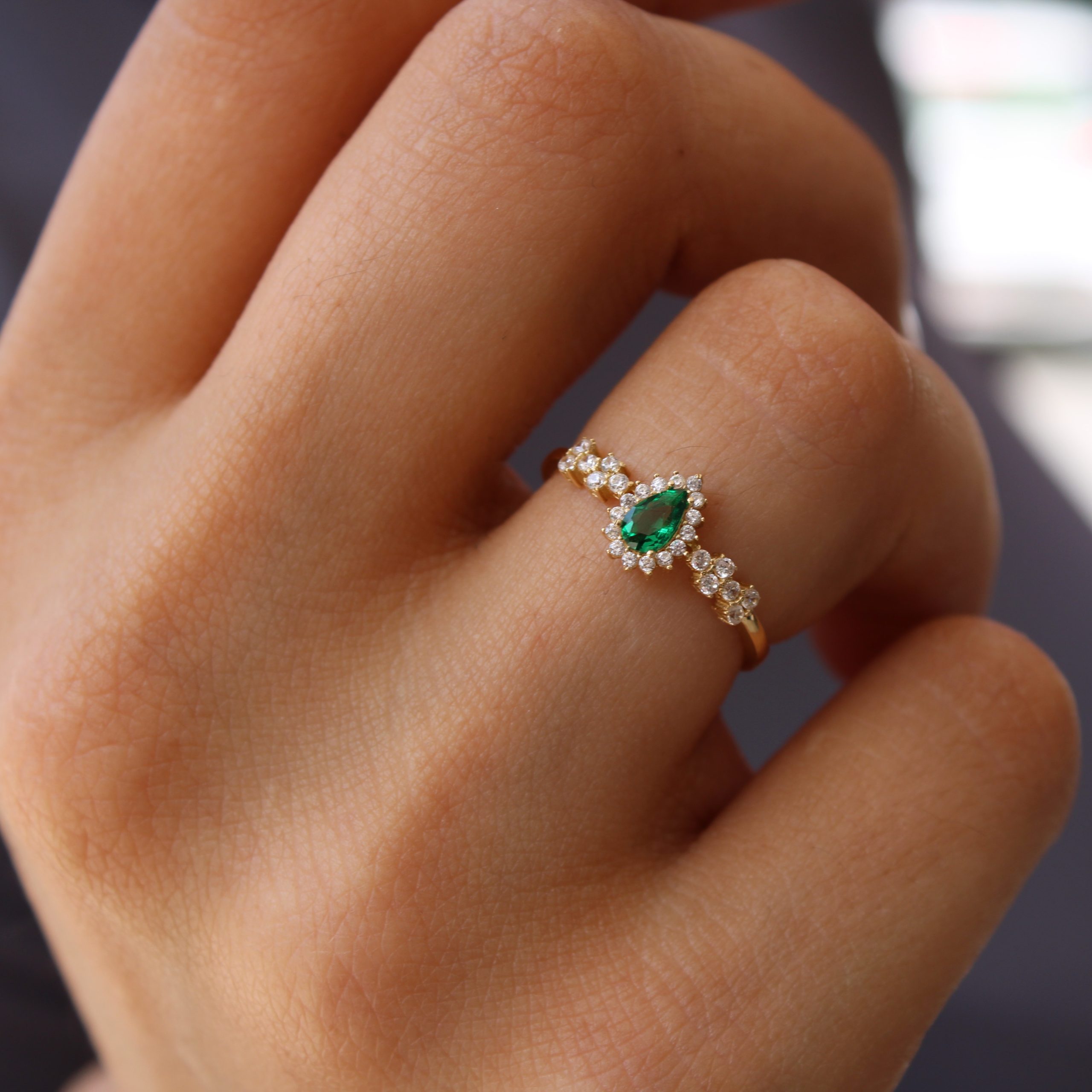 Ένα εντυπωσιακό δαχτυλίδι από χρυσό 14 καρατίων με πράσινη πέτρα σε σχήμα σταγόνας στο κέντρο και περιμετρικά διακοσμημένο με λαμπερές λευκές πέτρες. Ένα κομψό και ιδιαίτερο κόσμημα που συνδυάζει την πολυτέλεια με τη διαχρονικότητα. Ιδανικό και ως δώρο για ξεχωριστές περιστάσεις.