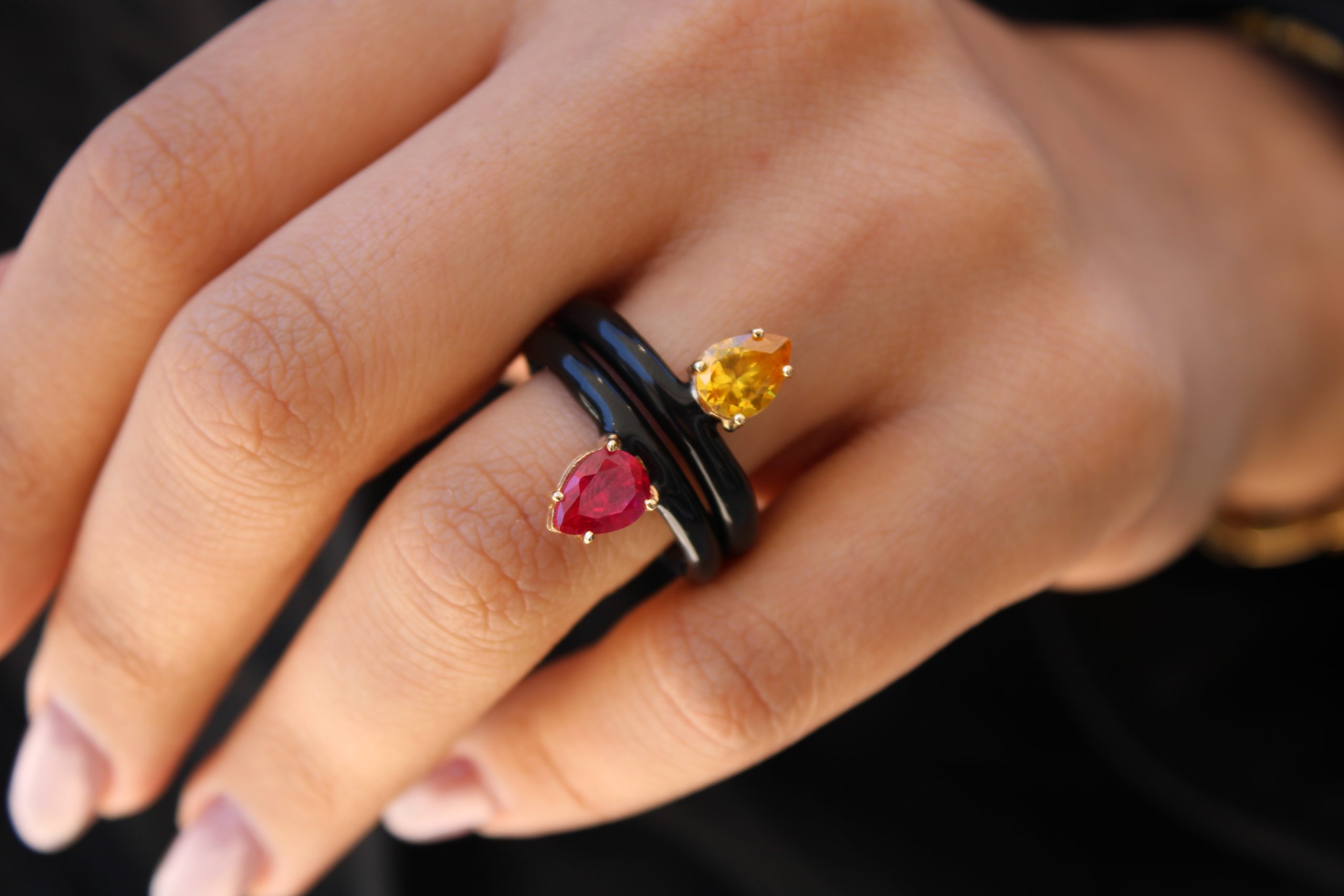 Ο δυναμικός του σχεδιασμός συνδυάζει το εκλεπτυσμένο μαύρο σμάλτο υψηλής αντοχής με μια εντυπωσιακή πέτρα δάκρυ από κίτρινο quartz. Το καστόνι είναι κατασκευασμένο από χρυσό 14 καρατίων, ενώ στη βάση του σμάλτου υπάρχει ασήμι 925 — για ανθεκτικότητα και αίσθηση πολυτέλειας.