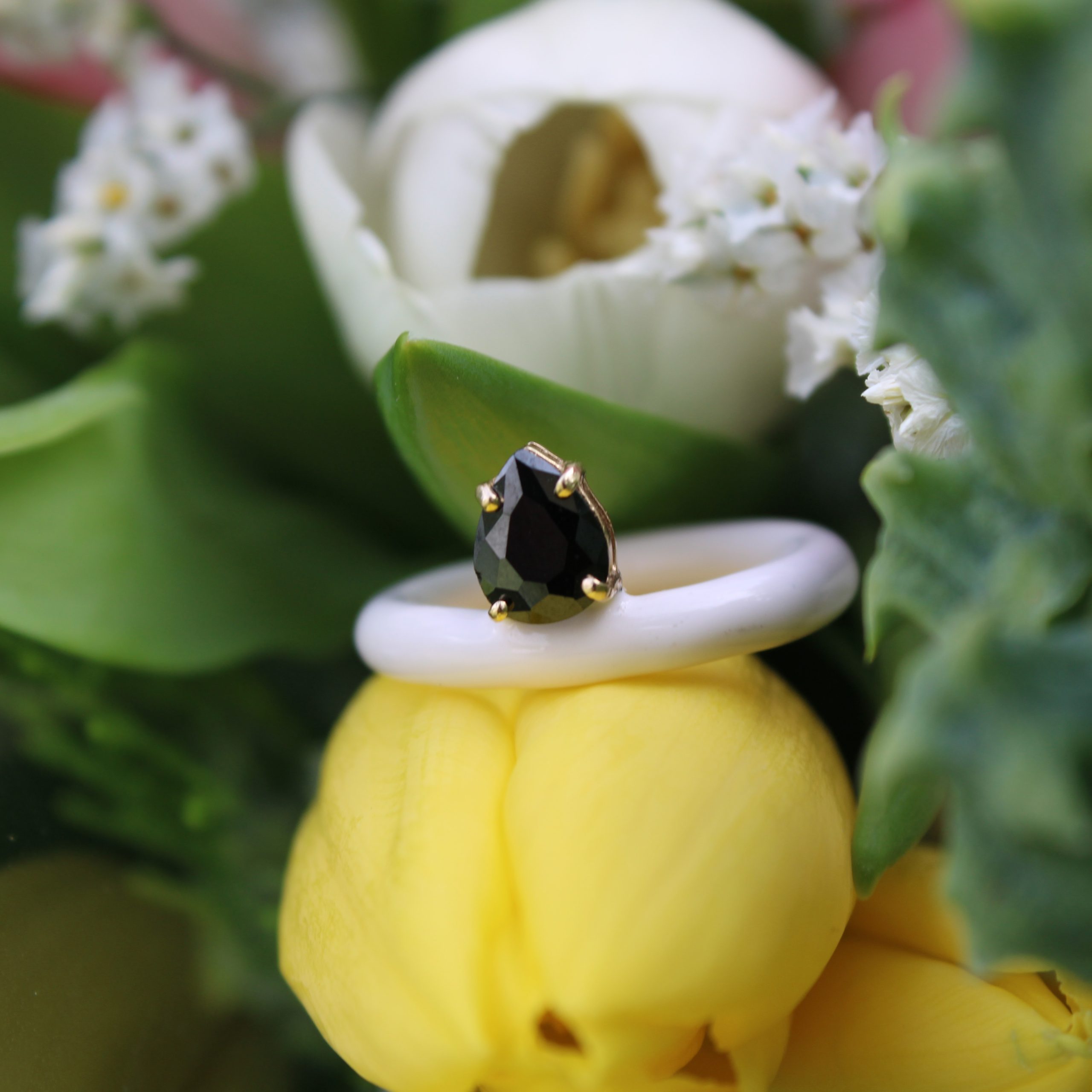 Ο δυναμικός του σχεδιασμός συνδυάζει το εκλεπτυσμένο λευκό σμάλτο υψηλής αντοχής με μια εντυπωσιακή πέτρα δάκρυ από μαύρο quartz. Το καστόνι είναι κατασκευασμένο από χρυσό 14 καρατίων, ενώ στη βάση του σμάλτου υπάρχει ασήμι 925 — για ανθεκτικότητα και αίσθηση πολυτέλειας.
