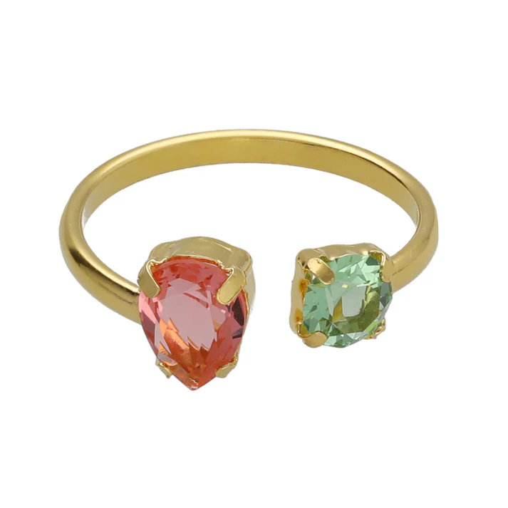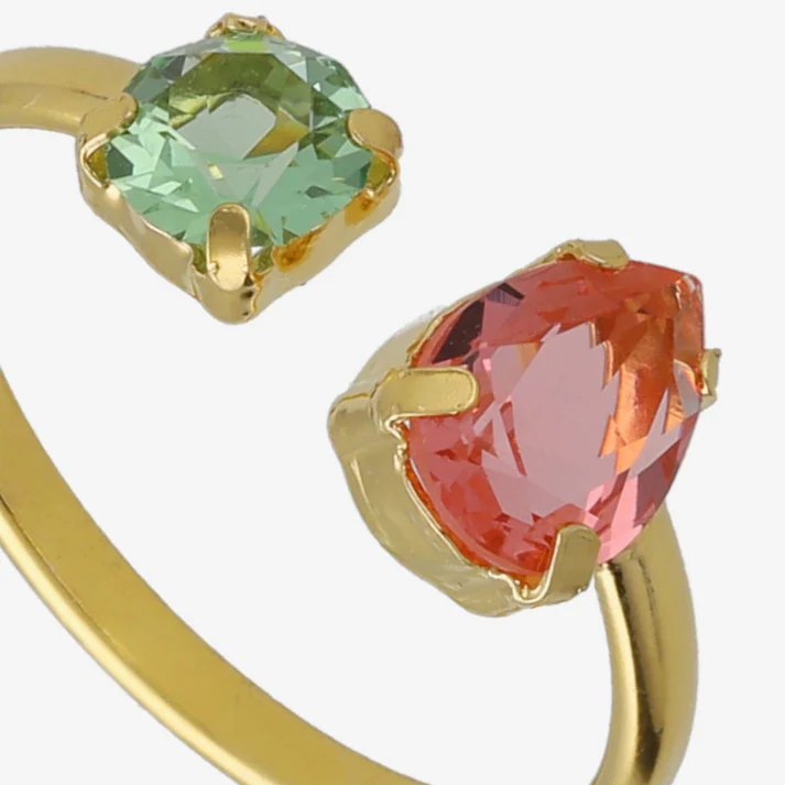Ανακαλύψτε το εντυπωσιακό δαχτυλίδι VICTORIA CRUZ από ασήμι 925 με επιχρύσωση 18 καρατίων, διακοσμημένο με δύο λαμπερές πέτρες: μία πράσινη και μία πορτοκαλί. Το ανοιγόμενο σχέδιο του δαχτυλιδιού προσφέρει άνεση και ευελιξία, προσαρμόζοντας το τέλεια σε κάθε δάχτυλο.