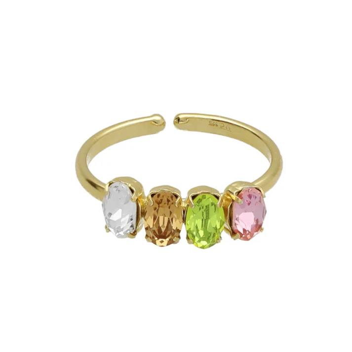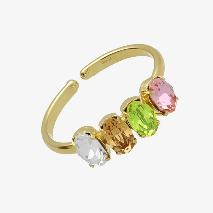 Λαμπερό και γεμάτο ζωντάνια, αυτό το δαχτυλίδι σειρέ της VICTORIA CRUZ ξεχωρίζει με τις πολύχρωμες οβάλ πέτρες που αγκαλιάζουν απαλά το δάχτυλο. Κατασκευασμένο από ασήμι 925 με επιχρύσωμα, προσφέρει έναν τέλειο συνδυασμό κομψότητας και χαρούμενης ενέργειας.