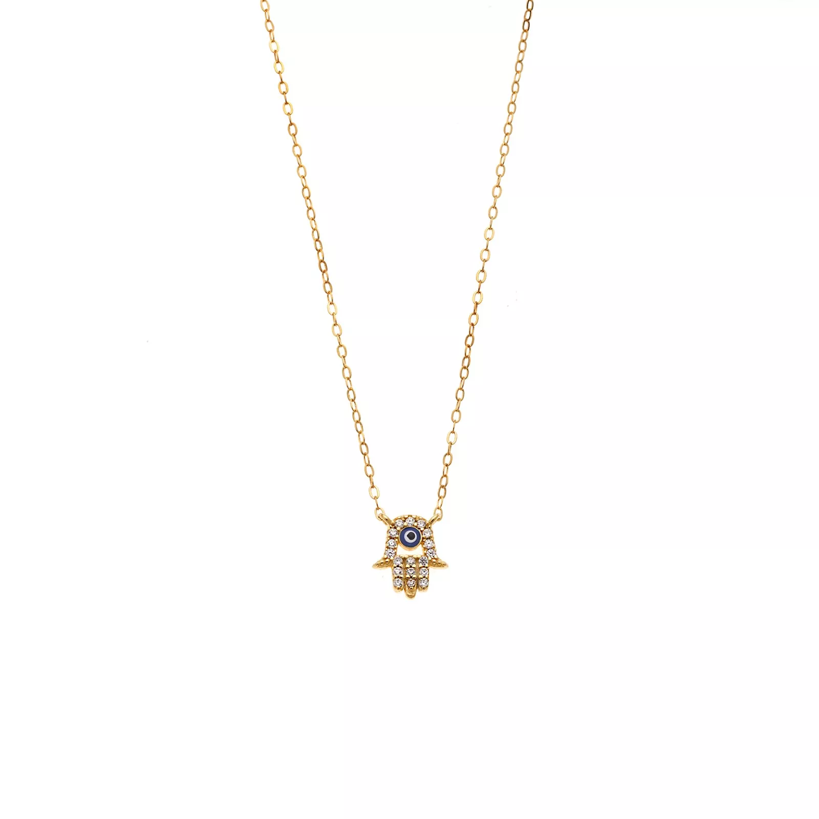 Φόρεσε στυλ και προστασία με αυτό το εντυπωσιακό γυναικείο κολιέ που συνδυάζει το διαχρονικό σύμβολο του Χεριού της Φατίμα με το ματάκι για απομάκρυνση της αρνητικής ενέργειας. Διακοσμημένο με λαμπερά λευκά ζιργκόν και λεπτομέρειες που μαγνητίζουν το βλέμμα, το μενταγιόν αιωρείται σε μια κομψή, λεπτή αλυσίδα σε χρυσό χρώμα.