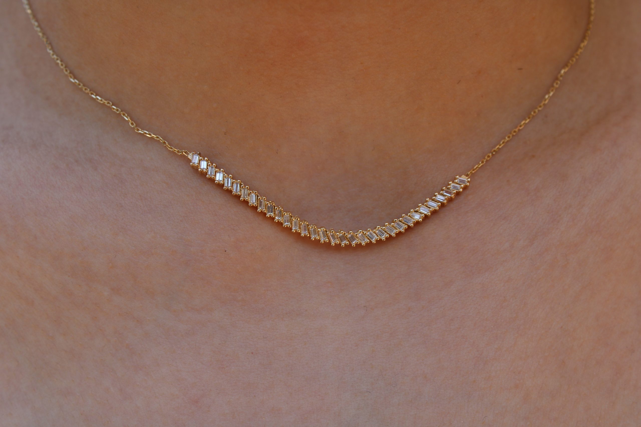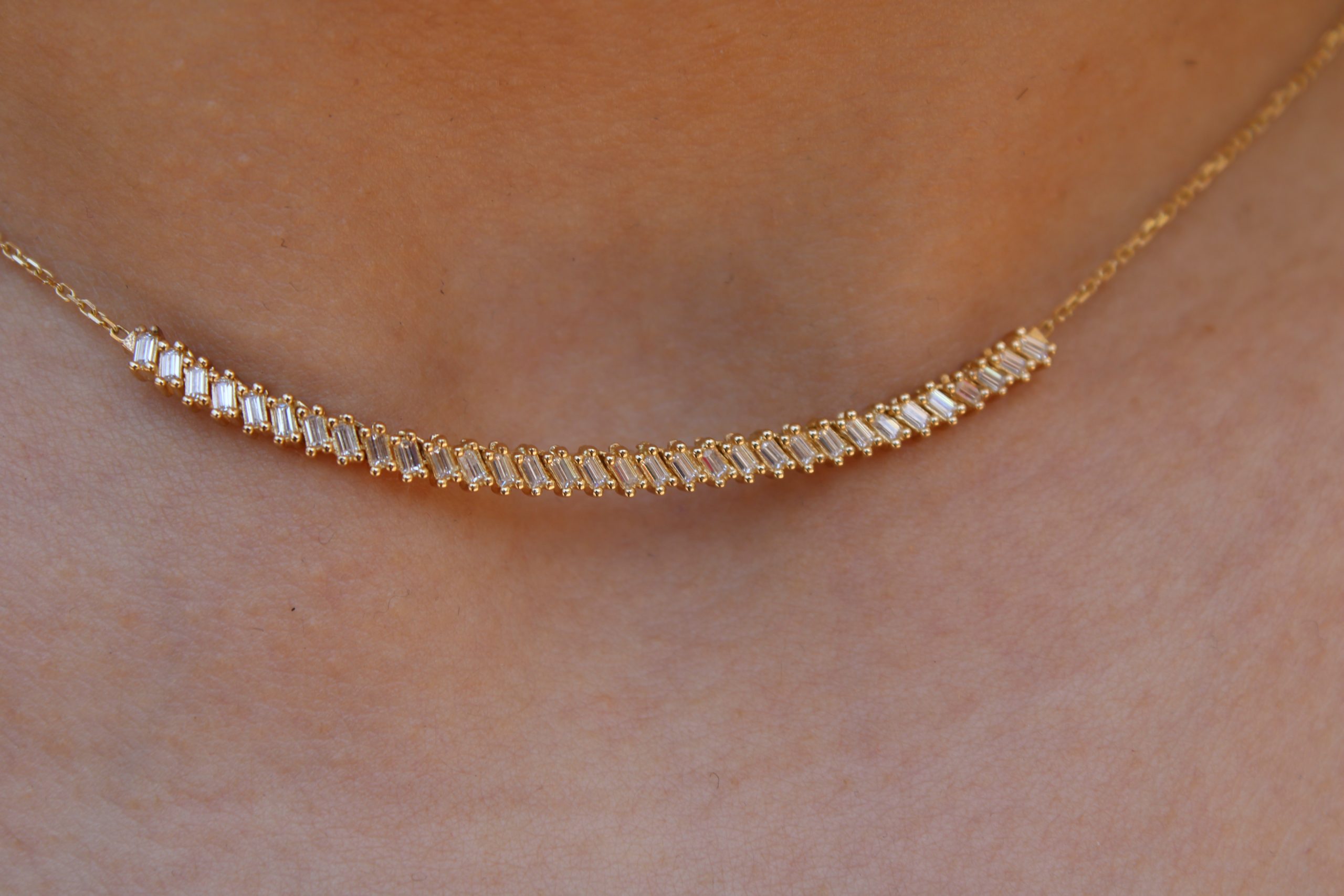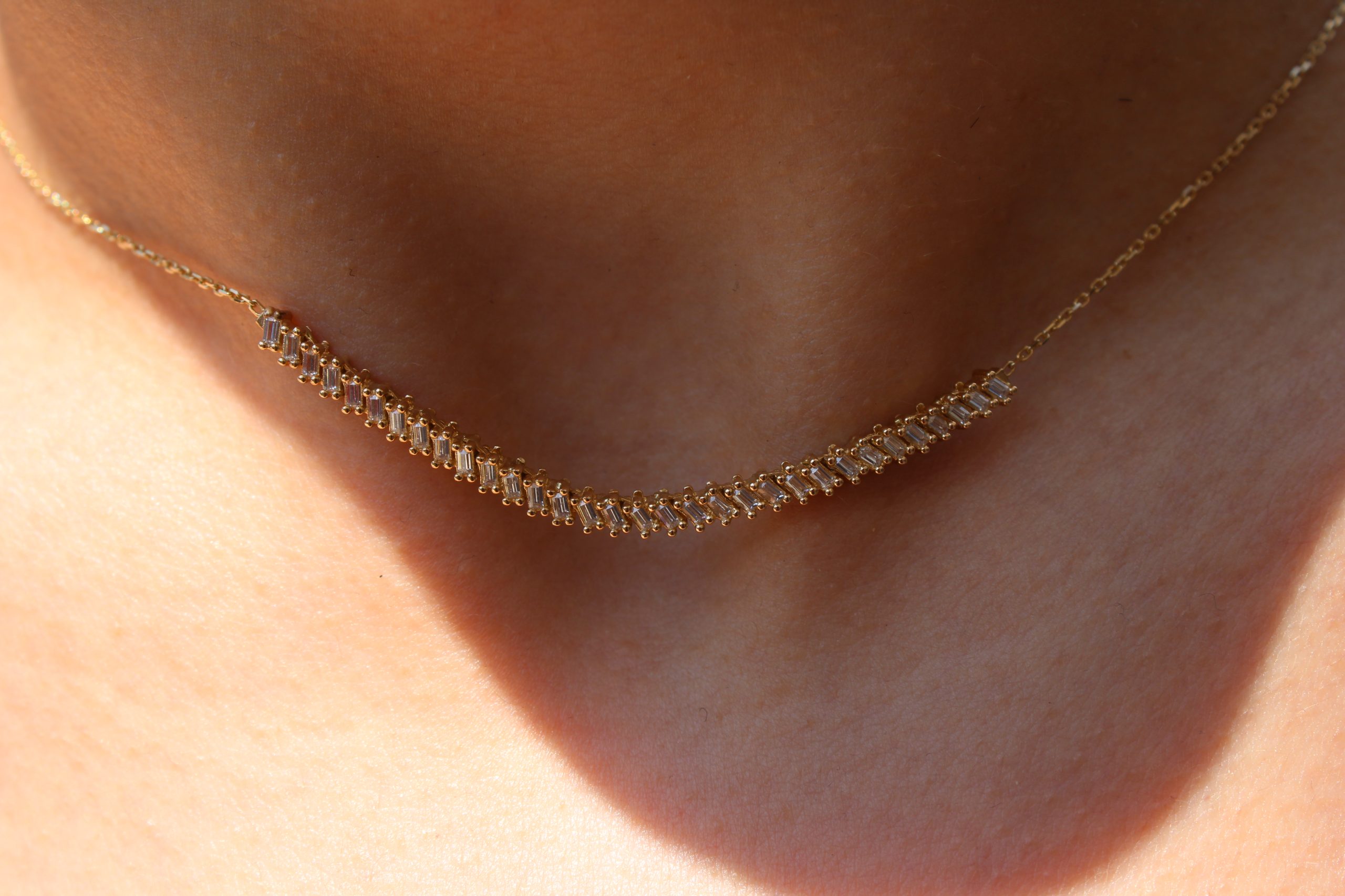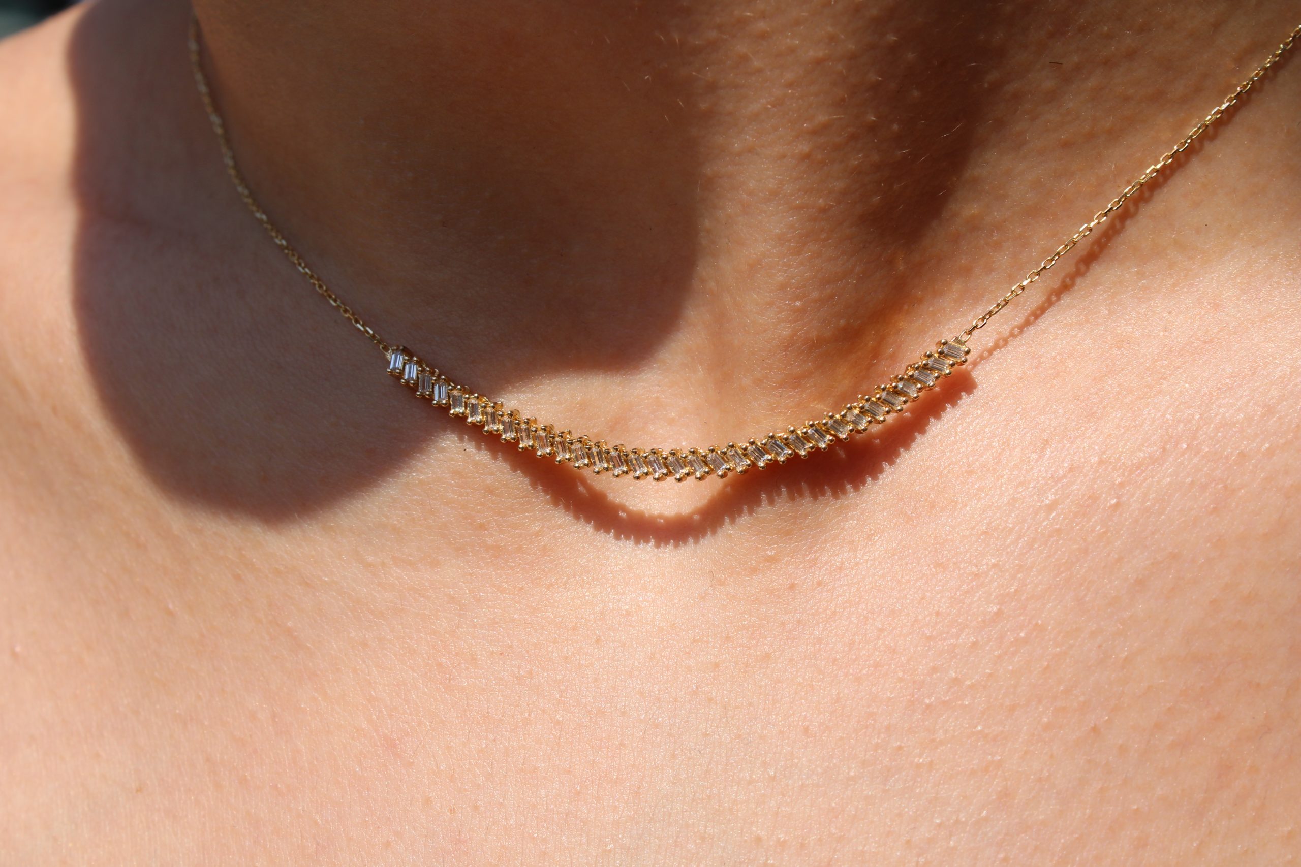 Ένα εκθαμβωτικό κολιέ από χρυσό 14 καρατίων, διακοσμημένο με διαδοχικές μπάρες λευκής πέτρας που προσφέρουν μοναδική λάμψη σε κάθε σου κίνηση. Με μοντέρνα γραμμή και διαχρονική κομψότητα, αποτελεί το απόλυτο statement κομμάτι για όλες τις ώρες της ημέρας