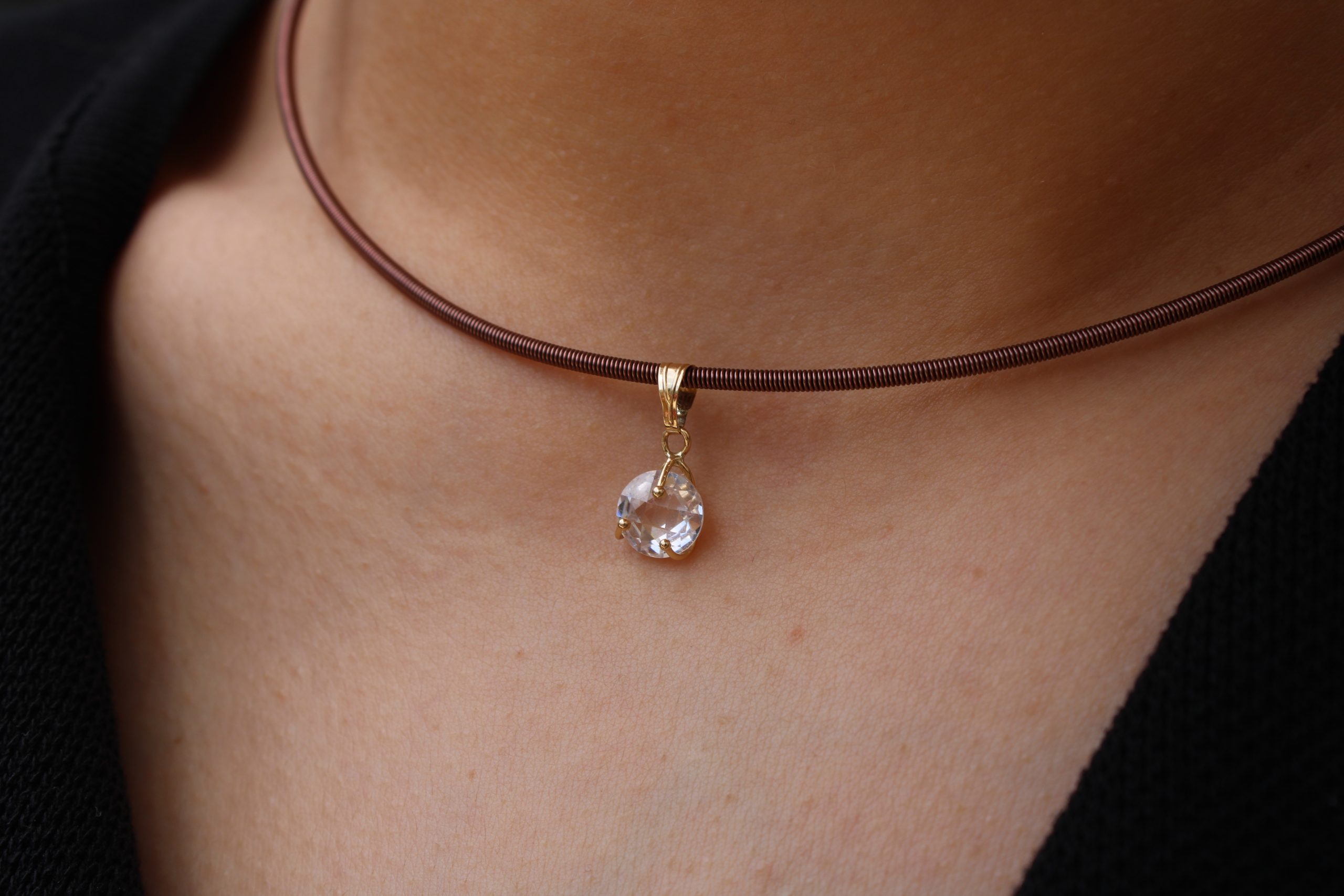 Λιτό και φωτεινό, το μενταγιόν αυτό αποπνέει διαχρονική κομψότητα. Το δάκρυ-πέτρα που αιωρείται απαλά στη βάση από χρυσό 14 καρατίων αιχμαλωτίζει το φως και δημιουργεί μια αίσθηση καθαρότητας και διαύγειας – σαν σταγόνα από κρύσταλλο.