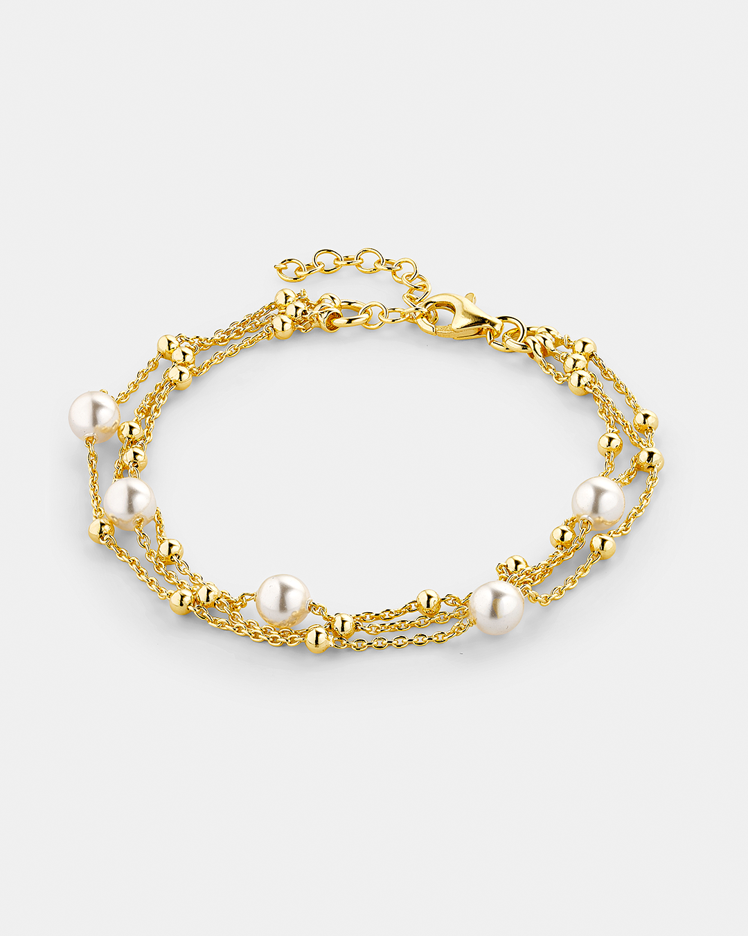 Ένα εντυπωσιακό πολύσειρο βραχιόλι που συνδυάζει λεπτές χρυσές αλυσίδες με λαμπερά μαργαριτάρια, δημιουργώντας ένα κομψό και μοντέρνο αποτέλεσμα. Οι πολλαπλές σειρές χαρίζουν όγκο και κίνηση, ενώ τα μικρά χρυσά στοιχεία προσθέτουν διακριτική λάμψη σε κάθε σου κίνηση.