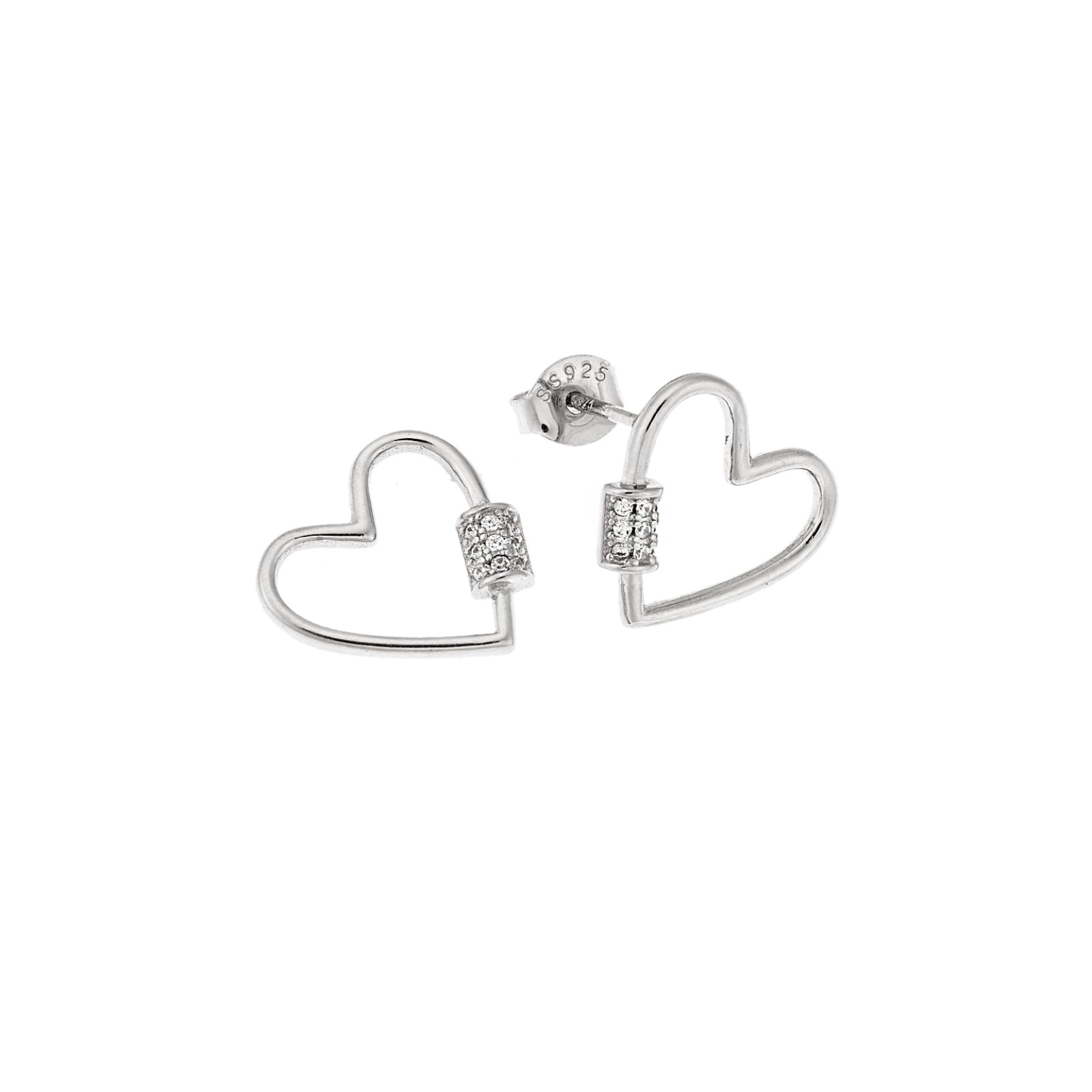 Κομψά ασημένια σκουλαρίκια καρφωτά σε σχήμα καρδιάς, διακοσμημένα με μικρό κυλινδράκι στολισμένο με λαμπερές λευκές πέτρες. Ιδανικά για κάθε στιγμή, προσθέτουν διακριτική λάμψη και ρομαντική κομψότητα.