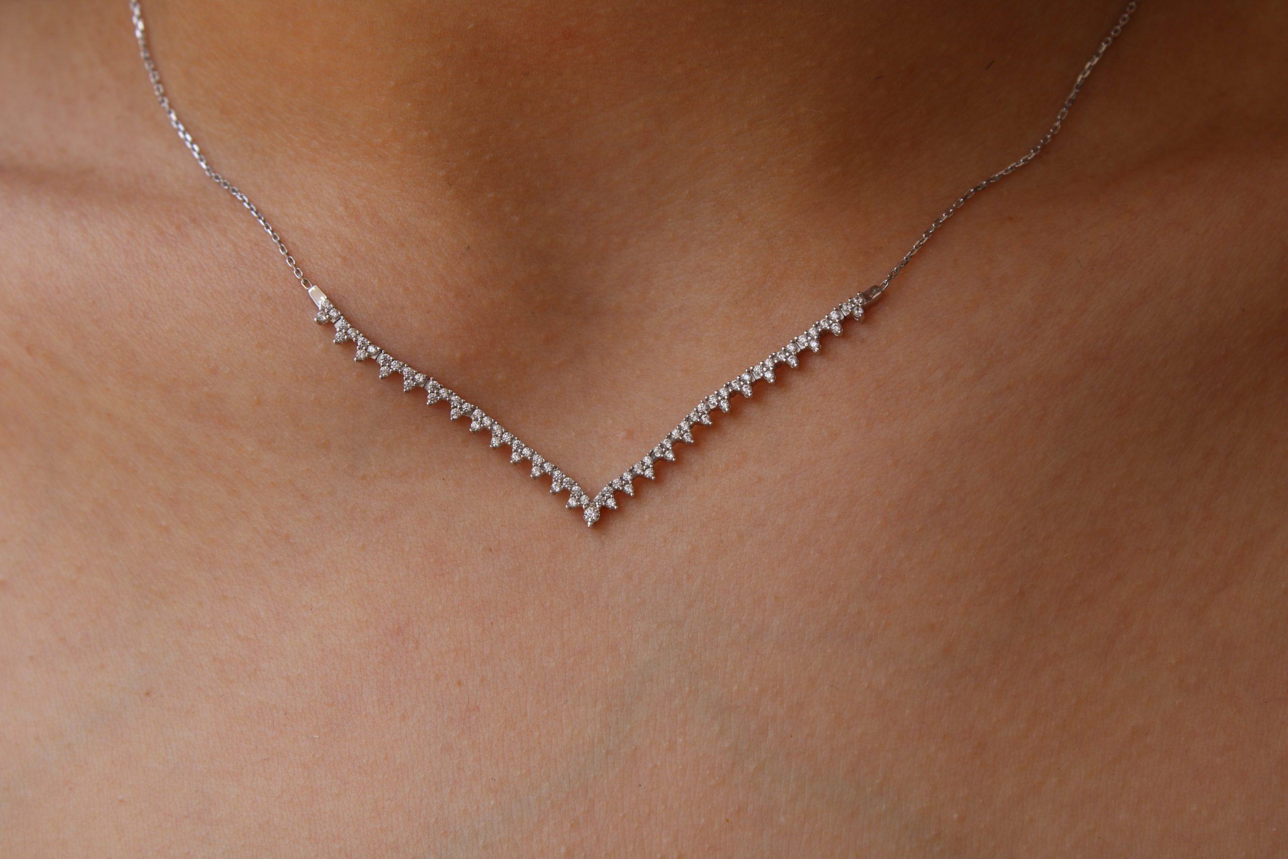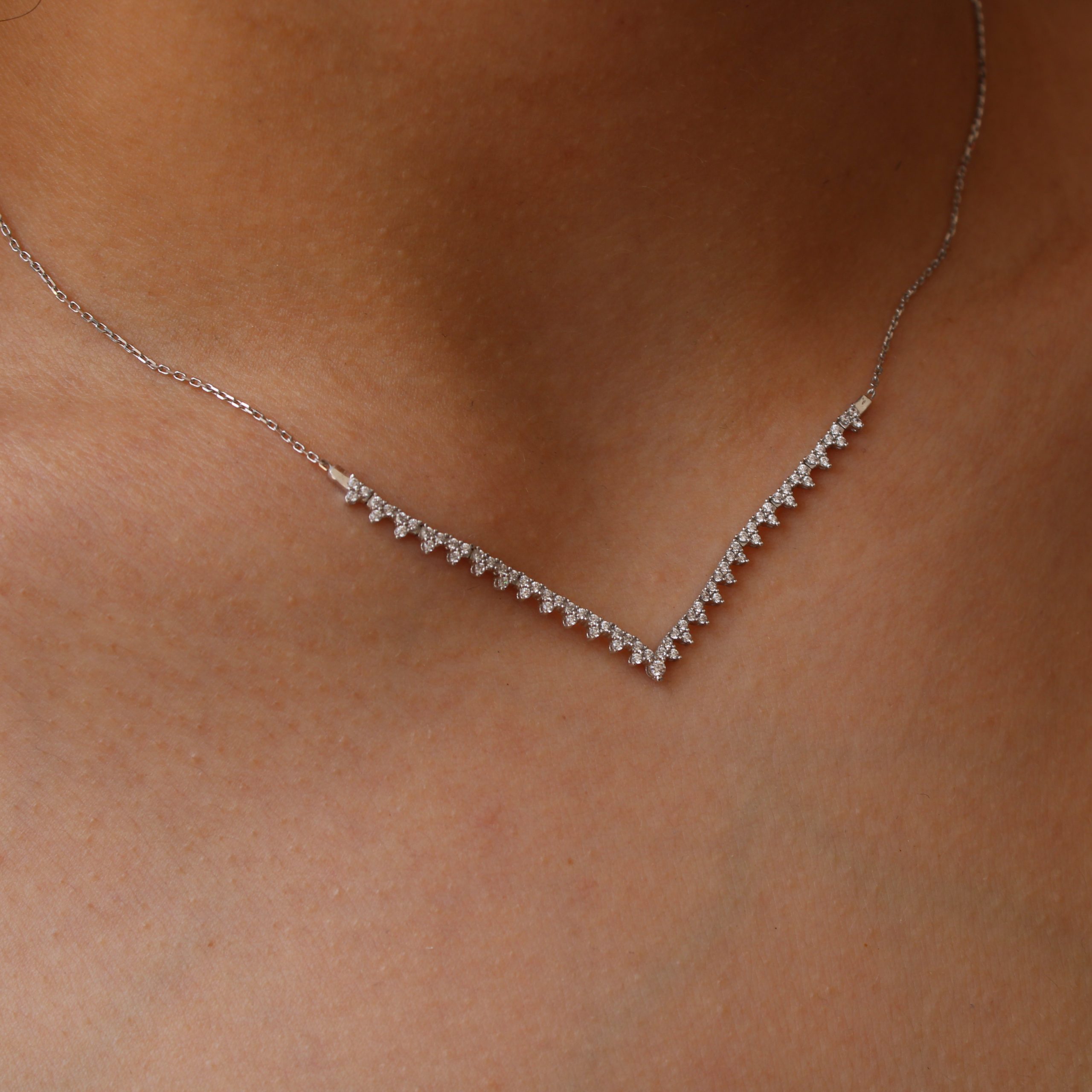 Κάθε του γωνία, μια δήλωση κομψότητας. Το V κολιέ από λευκό χρυσό 14Κ, διακοσμημένο με λαμπερές λευκές πέτρες σε διαδοχική διάταξη, αγκαλιάζει το λαιμό με γεωμετρική ακρίβεια και εκλεπτυσμένη λάμψη.