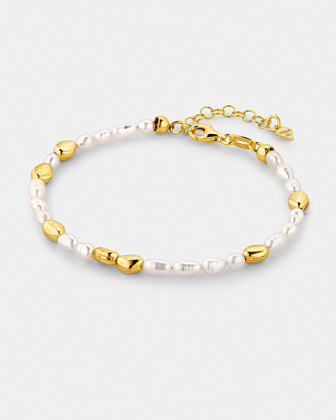 Ένα κομψό και διαχρονικό βραχιόλι που συνδυάζει φυσικά μαργαριτάρια με χρυσές λεπτομέρειες, δημιουργώντας μια ισορροπία ανάμεσα στο ρομαντικό και το μοντέρνο. Οι ακανόνιστες φόρμες των μαργαριταριών δίνουν μοναδικό χαρακτήρα, ενώ τα χρυσά στοιχεία προσθέτουν μια διακριτική λάμψη που τραβάει τα βλέμματα.