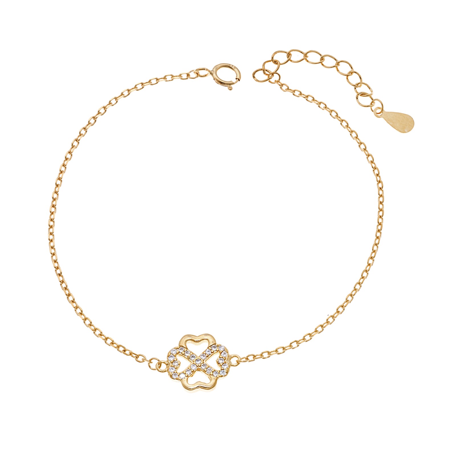 Φέρτε τύχη και κομψότητα σε κάθε σας εμφάνιση με αυτό το επιχρυσωμένο βραχιόλι από ασήμι 925, διακοσμημένο με ένα λεπτεπίλεπτο τριφύλλι και λαμπερές λευκές πέτρες. Το τριφύλλι συμβολίζει τύχη και θετική ενέργεια, ενώ οι λευκές πέτρες προσθέτουν μια διακριτική αλλά εκθαμβωτική λάμψη. Ένα κόσμημα που συνδυάζει στυλ, φινέτσα και θετική ενέργεια, προσφέροντας μοναδική λάμψη σε κάθε στιγμή.